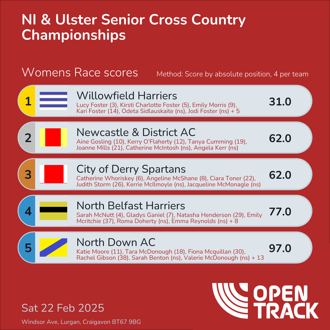 288.0 | 15: Patricia O’Hagan (15), 70: Ciara Austin (70), 98: Nadine Murray (98), 105: Ciara Hoey (105) | |