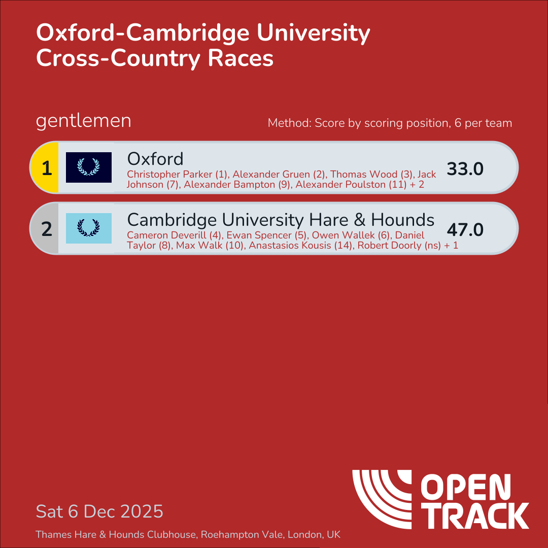 33.0 | 1: Christopher Parker (1), 2: Alexander Gruen (2), 3: Thomas Wood (3), 7: Jack Johnson (7), 9: Alexander Bampton (9), 11: Alexander Poulston (11) | |