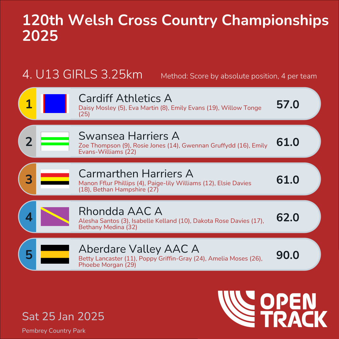 | 4 | 4 | Manon Fflur Phillips | U13G |