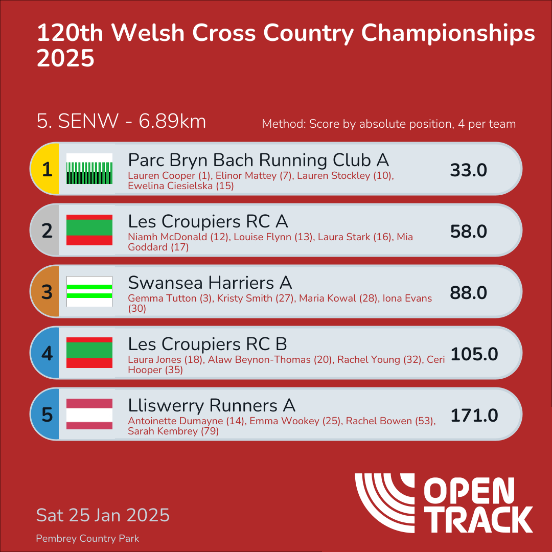 177.0 | 21: Clare Patterson (21), 43: Beth Jones (43), 50: Sian Jones (50), 63: Sarah Jeremiah (63) | |