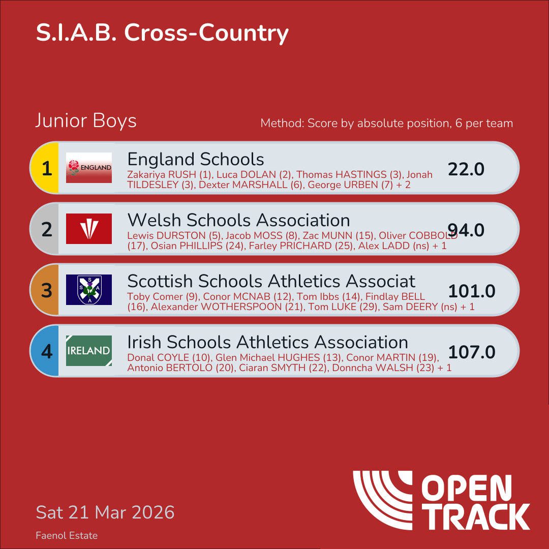 22.0 | 1: Zakariya RUSH (1), 2: Luca DOLAN (2), 3: Thomas HASTINGS (3), 3: Jonah TILDESLEY (3), 6: Dexter MARSHALL (6), 7: George URBEN (7) | |