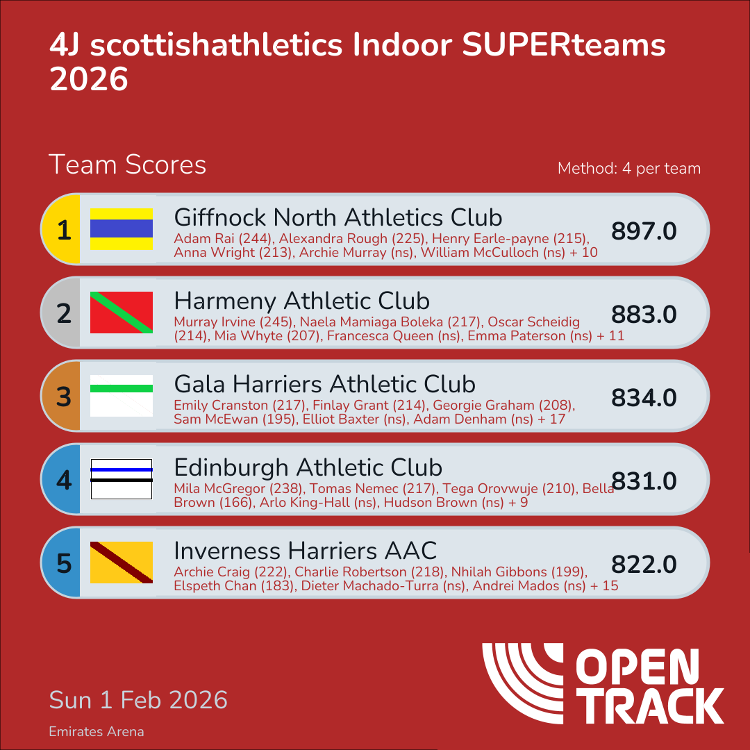 680.0 62Hadley Masson (188)91Harris Robertson (178)119Niamh Hastie (167)182Isobel Denholm (147)