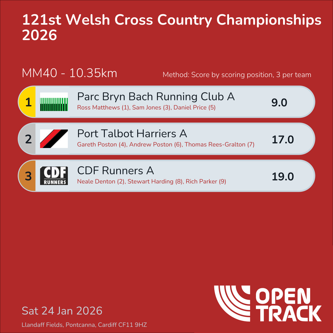 17.0 | 99: Gareth Poston (4), 124: Andrew Poston (6), 150: Thomas Rees-Gralton (7) | |