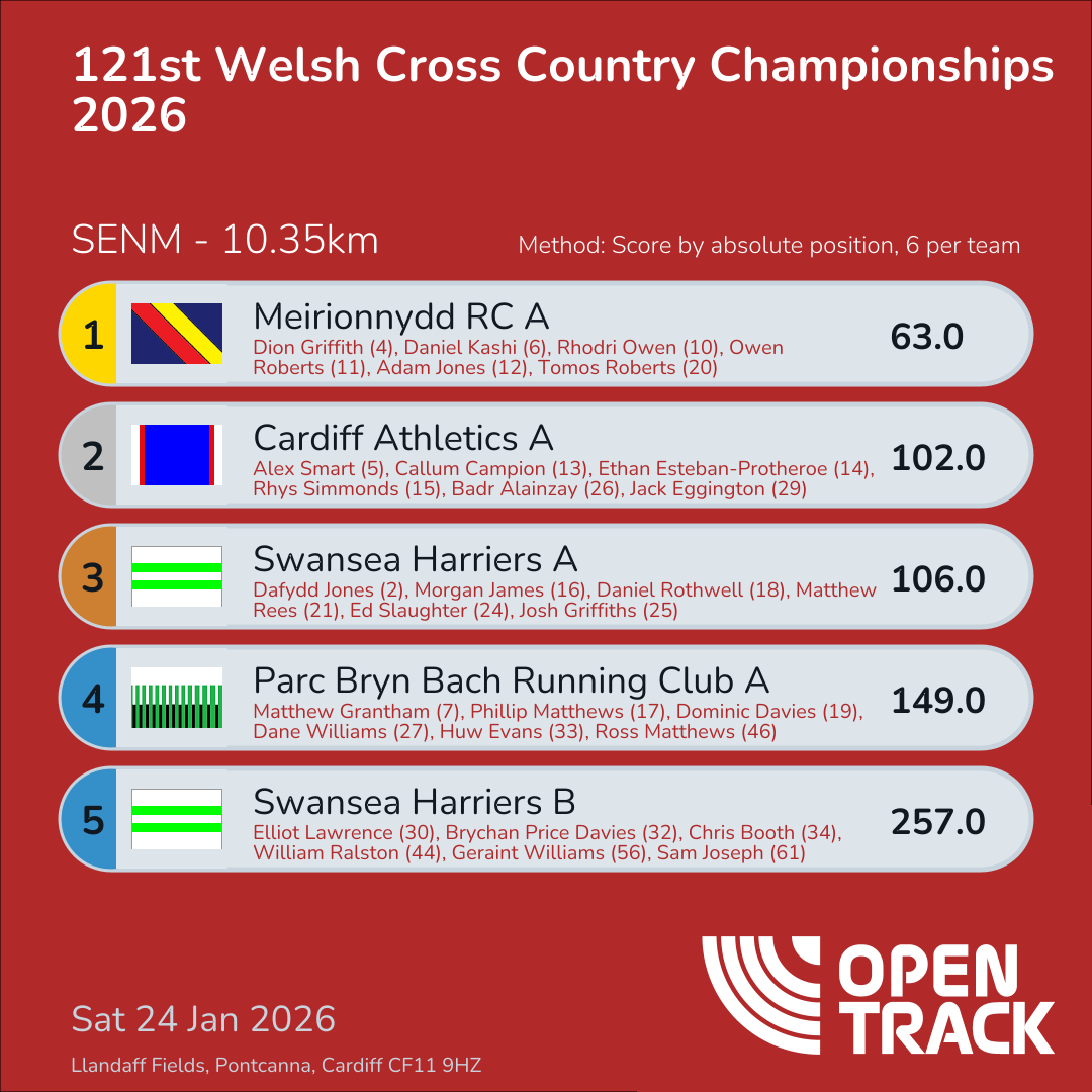 257.0 | 30: Elliot Lawrence (30), 32: Brychan Price Davies (32), 34: Chris Booth (34), 44: William Ralston (44), 56: Geraint Williams (56), 61: Sam Joseph (61) | |