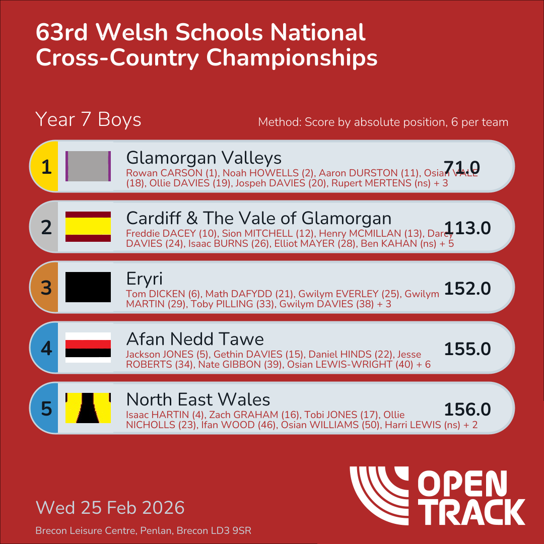 | 3 | ERY | 152.0 | 6: Tom DICKEN (6), 21: Math DAFYDD (21), 25: Gwilym EVERLEY (25), 29: Gwilym MARTIN (29), 33: Toby PILLING (33), 38: Gwilym DAVIES (38) | |